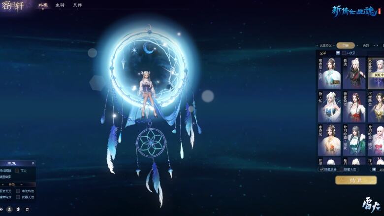 容月轩设置面板中设有特效显示勾选栏,无论是时装华彩披身的效果抑或是光效褪去后材质细节的处理,少侠都可一览无余。此外,容月轩界面中还可对天气进行设定,少侠既可欣赏时装在朝云中晶莹闪亮,也可欣赏其在夜空中煜煜生辉。