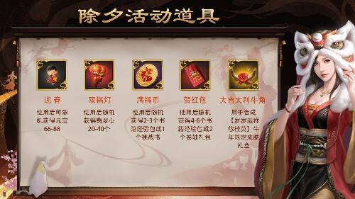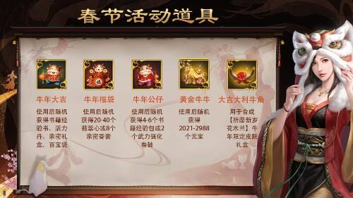 除夕夜,家团圆,贺喜迎新年。使用迎春,双福灯,满福币和贺红包等除夕活动道具,有机会获得66-88元宝, 20-40个翡翠心,2-6个书籍经验包、技能经验等游戏道具。在除夕活动期间收集大吉大利牛角,还可以合成牛年限定的【岁岁迎祥 穆桂英】皮肤礼盒,为你心爱的红颜换上新衣~