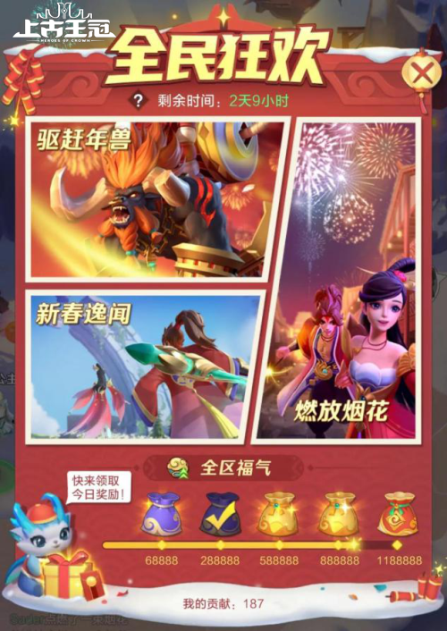 2月4日起玩家每天可领取签到奖励,第7天额外领取五星英雄自选礼盒,可从凛风咆哮、鬼面浪客、无限风暴、萤火之光、轮回骑士这5位英雄中任选其一,此外每天在春节光彩燃放烟花、挑战年兽都可以获得高级招募券、钻石、突破石、英雄碎片、春节福字等其他丰富奖励。