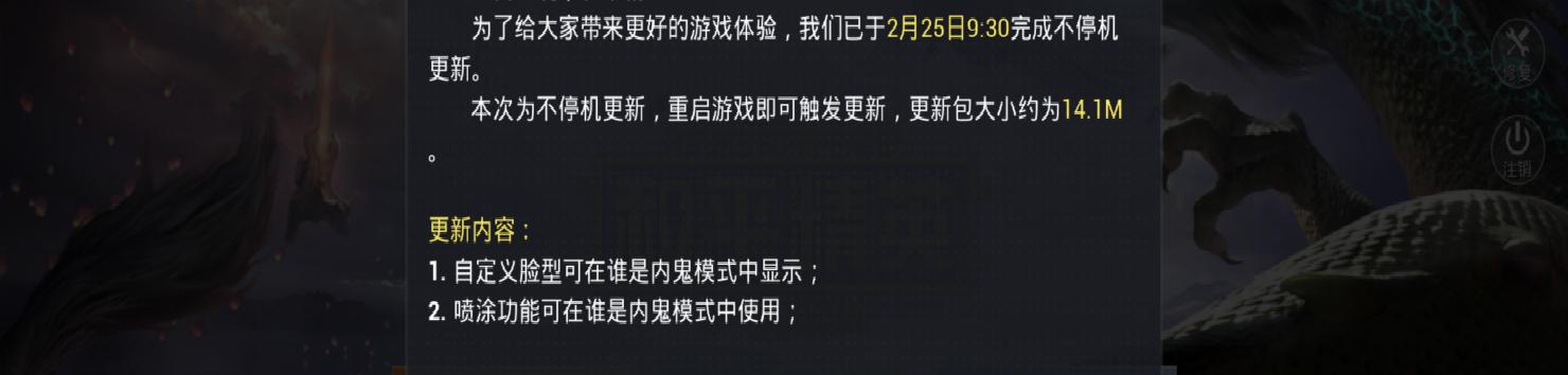 《和平精英》除了大版本的迭代更新,平日还会有几个M大小的“小更新”~现在有一个只有14.1M的小更新,这次给一个模式“谁是鬼”带来了两个“补充”。