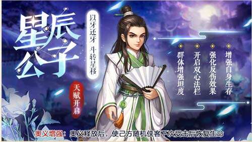 星辰公子的奥义星罗棋布具有强力控制效果,本次天赋开启后,星辰公子奥义释放后,使己方随机侠客下次受击后恢复生命。同时星辰公子也将增强自身的生存能力,强化自身反伤效果 、开启双心法栏并且具有增强团队坦度的能力。综合来看,判官和星辰公子都是攻防兼备的武林神话侠客,必能助力各位少侠逐鹿江湖,祝愿大家能够结识到心向往之的武林才俊,在《侠客风云传OL》中叱咤风云!