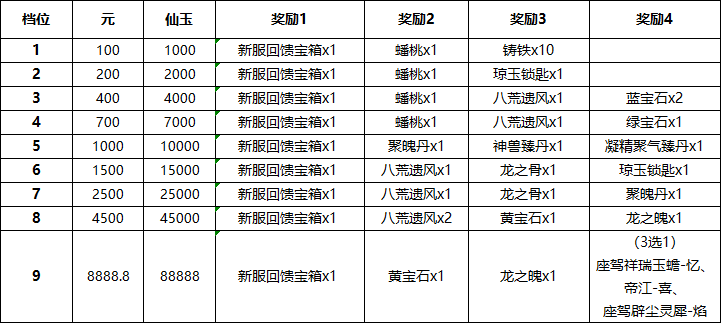 3.【新服大礼】3月12日-3月18日期间,成功充值(寄售点除外)并且兑换指定数量仙玉后即可领取新服大礼。3月25日-4月1日期间,更可开启回馈宝箱进行抽奖,可抽取八荒遗风、龙之骨、黄宝石等珍稀道具,每天最多使用五个。