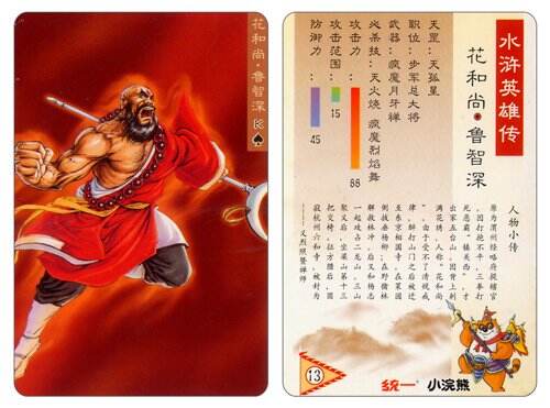 这给年幼的小张带来了不小的冲击,“腰阔十围”将近1米长度,鲁智深可是个实打实的重量级选手,功夫却一点不差,绝对称得上是灵活的胖子。恰逢小浣熊水浒卡风靡校园,小张也抽到了鲁智深,通过背面的小字,更了解到鲁智深的仗义为人,豁达心胸,渐渐明白梁山好汉行走于世间,并不依靠一身皮囊。