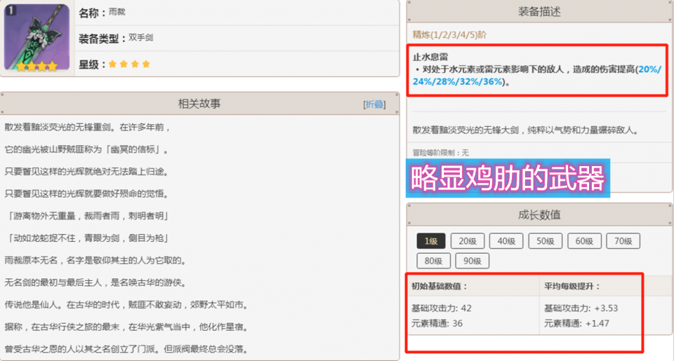 雨裁的基础攻击力在四星双手剑中属于中档的存在,整体的提升不算很大,副属性是极为独特的元素精通,对于这种属性,用的玩家很少,虽然它对元素反应的伤害有了很大的提升,在90级的时候可以增加40%左右的伤害,这还是相当可观的,但是它并不是输出角色的首选,因为它没有暴击和爆伤,所以这个属性导致了雨裁变成了鸡肋,被动技能就这么缺水雷。可以增加水或雷影响下敌人的伤害20%,直接增加伤害加成。不过我相信玩家应该知道,在现在的版本中,没有人会为了一件武器而专门换队,直接让伤害增加的相当的苛刻。如果有喜欢打水打雷的玩家,可以试试用这个武器。