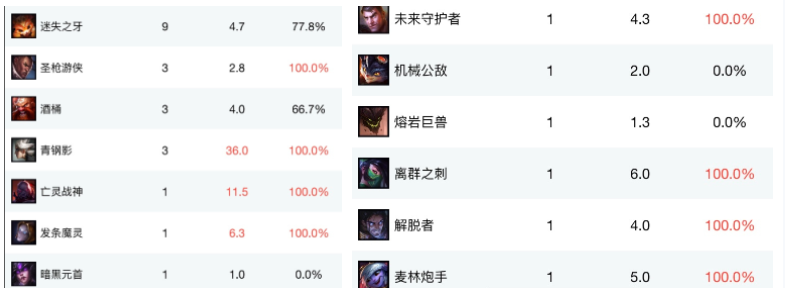 这一季,小虎在公司用了13个单人英雄!虽然看起来不多,但也可以称之为“小英雄海”。十三英雄中,正规订单还是比较少的,其中青钢营胜率最高,三局胜率100%,KDA高达30!可以看出,小虎确实花了很多时间练习这个英雄。另外,胜率最低的是那些被选中的,从来没赢过的英雄。但是不疼。