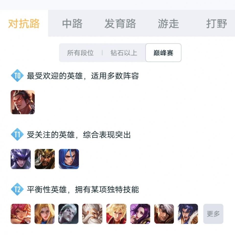 从营中英雄榜来看,吕布是最受欢迎的英雄,T0梯度;钻石之上的T1英雄是阎和亚瑟,巅峰对决中的T1是和,橙子牵强;无论是在钻石之上还是在顶级赛事中,芈月都只能排在T2梯队中。