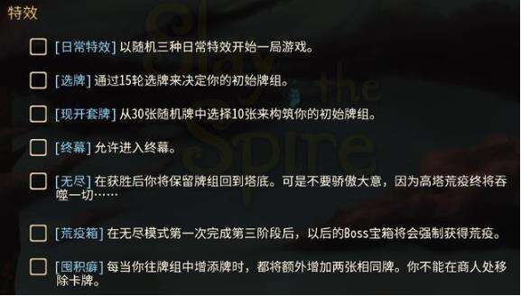 在完成了早期测试版的最后一个角色"故障机器人"的开发工作之后,Mega Crit Games还将视线转向了游戏模式,并随即推出了【自定模式】。这是《杀戮尖塔》自"每日挑战"之外推出的第三个游戏模式,和标准爬塔玩法的【标准模式】和每天都会更新不同玩法的【每日挑战】不同的是,【自定模式】允许玩家高度自定义一轮游戏的设置,包括能够设置不同的进阶等级,以及不同的特效等。在完成自定设置后,甚至可以上传"种子"到服务器,来与其他玩家分享自己改造后的"尖塔"。