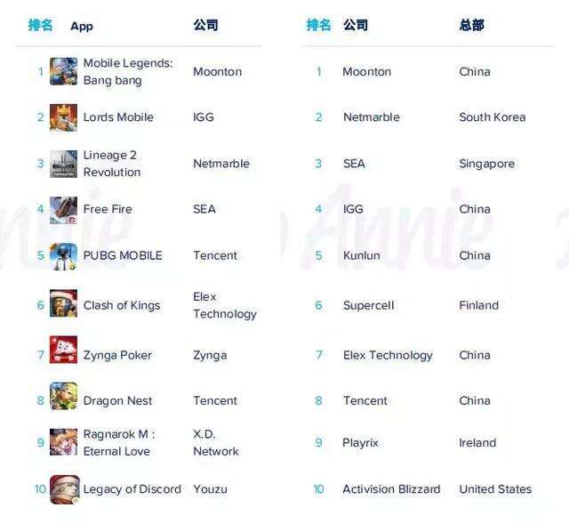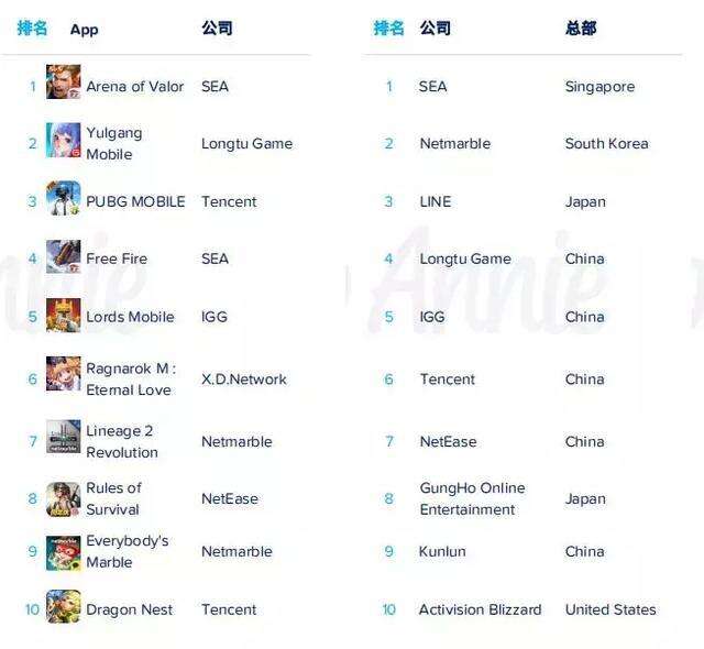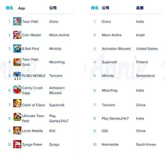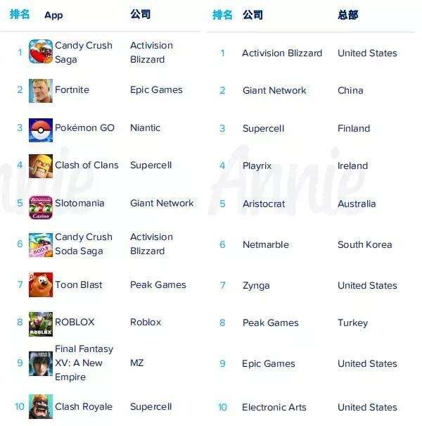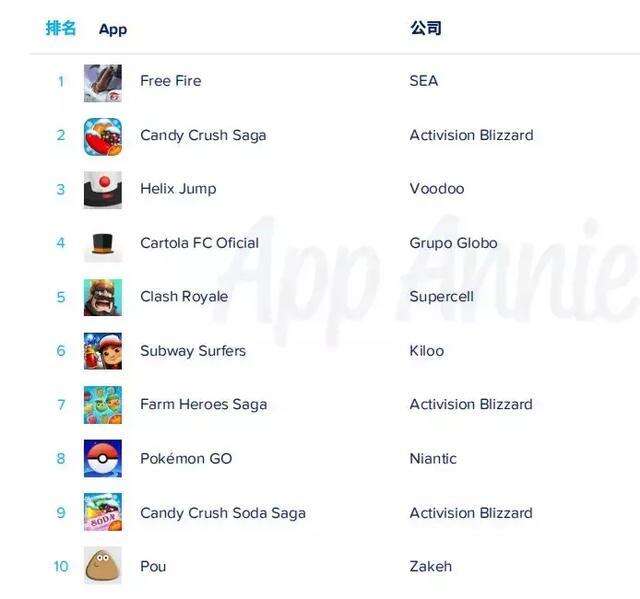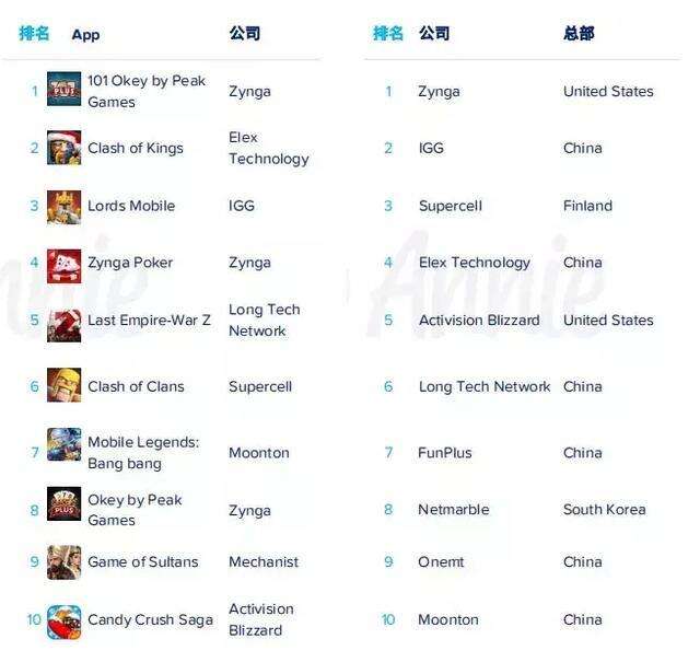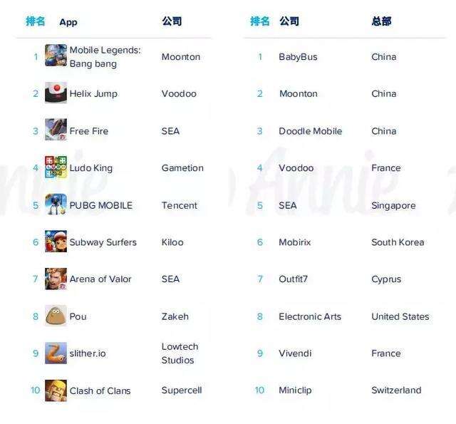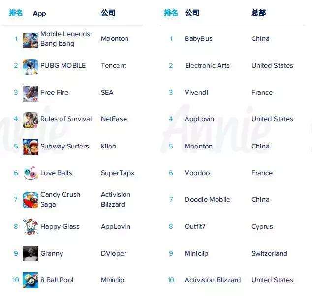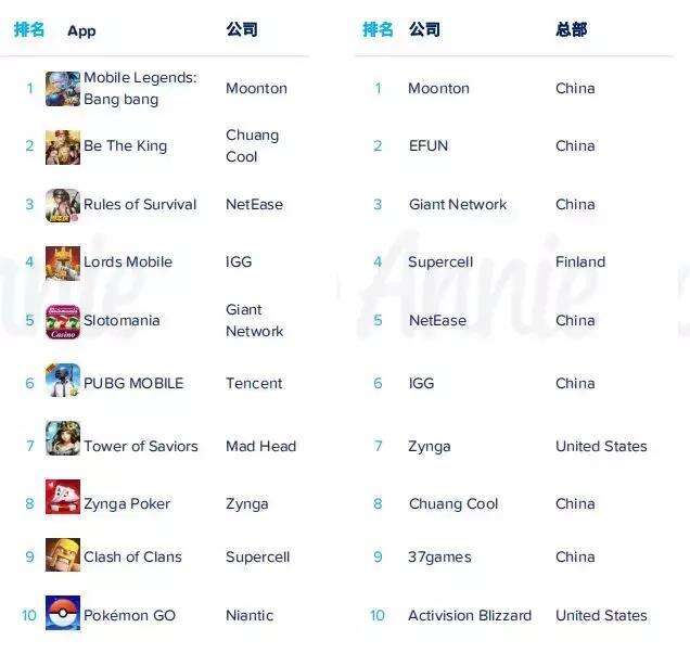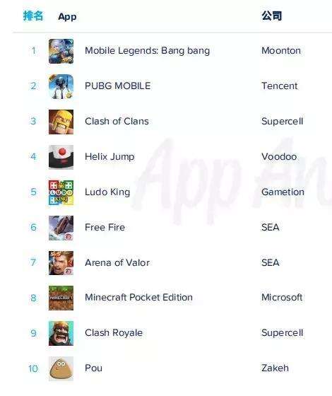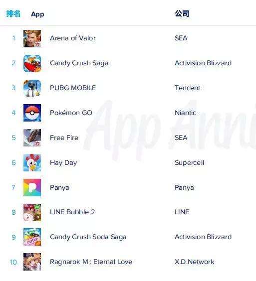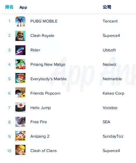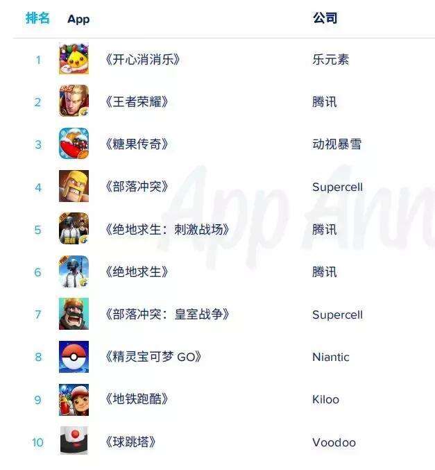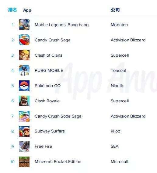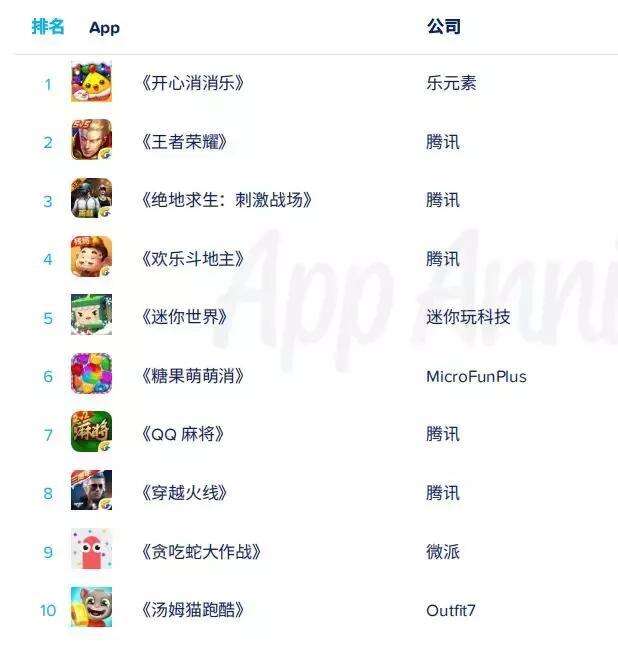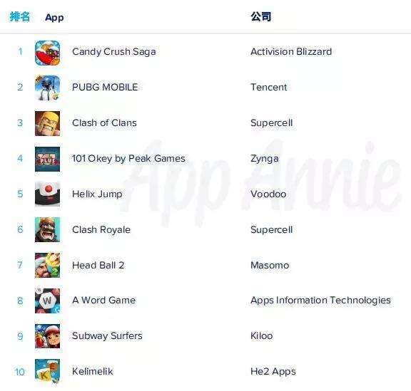 MAU榜:《开心消消乐》在中国拥有强大的用户基础,去年成为世界上MAU最高的游戏。腾讯有两个新的射击巡回赛和一个MOBA在名单上,整个名单基本上都是竞技游戏和休闲游戏。