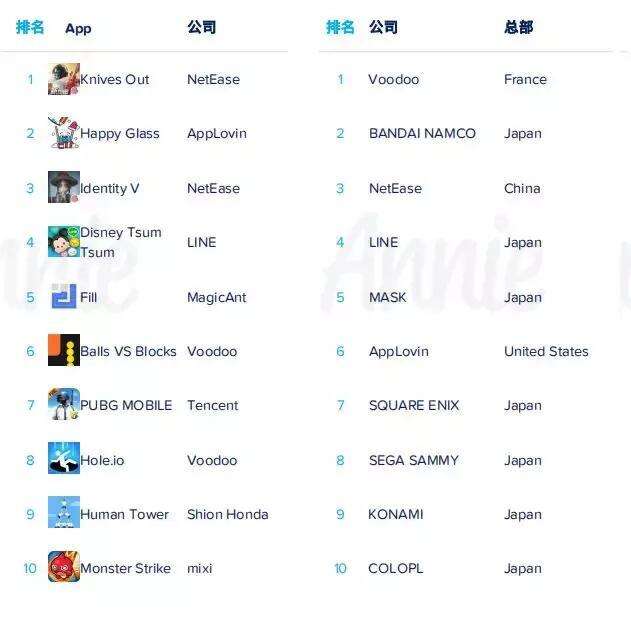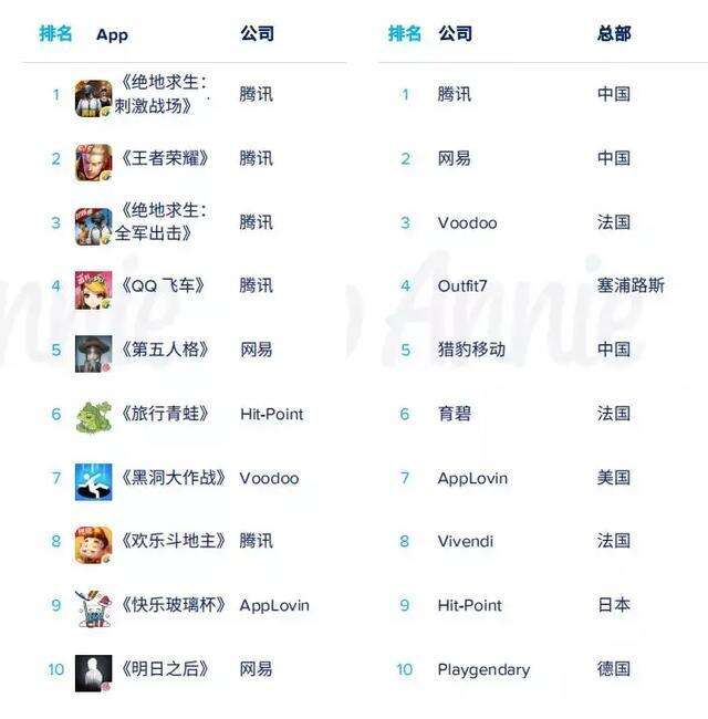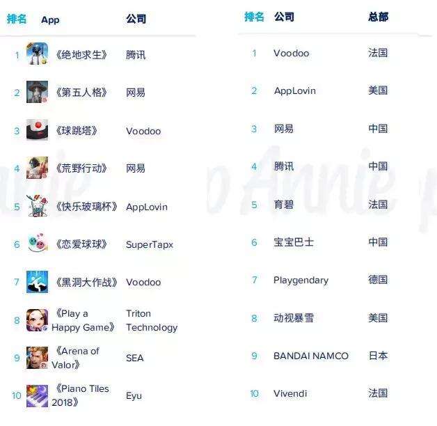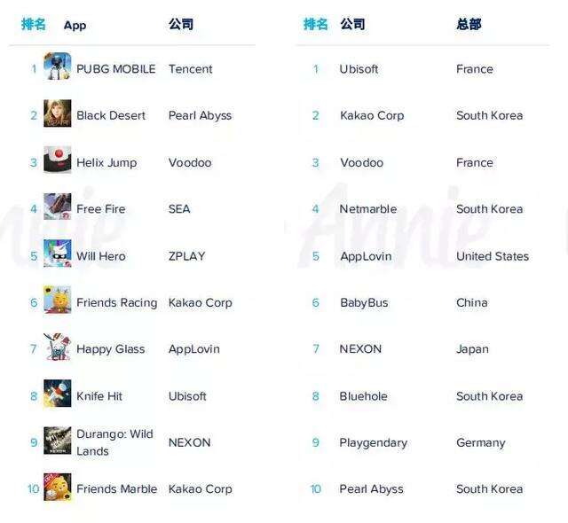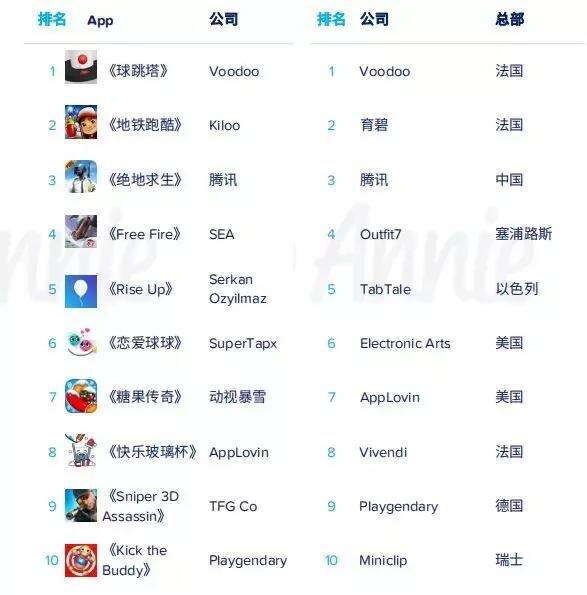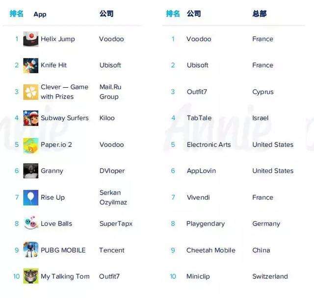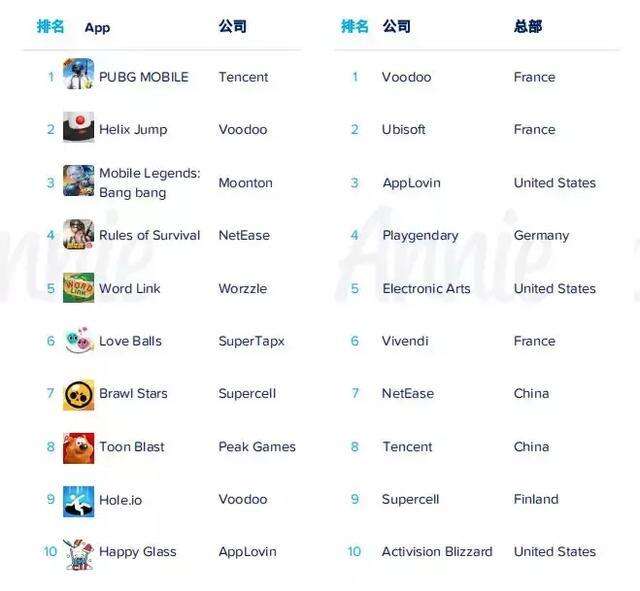 下载榜:伏都教的超级休闲游戏《球跳塔》成为2018年全球下载量最多的游戏,也帮助伏都教成为2018年全球下载量最多的游戏公司。腾讯《绝地求生》排名第三,而腾讯也是唯一在下载名单上的中国制造商。