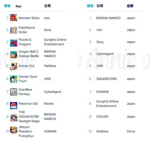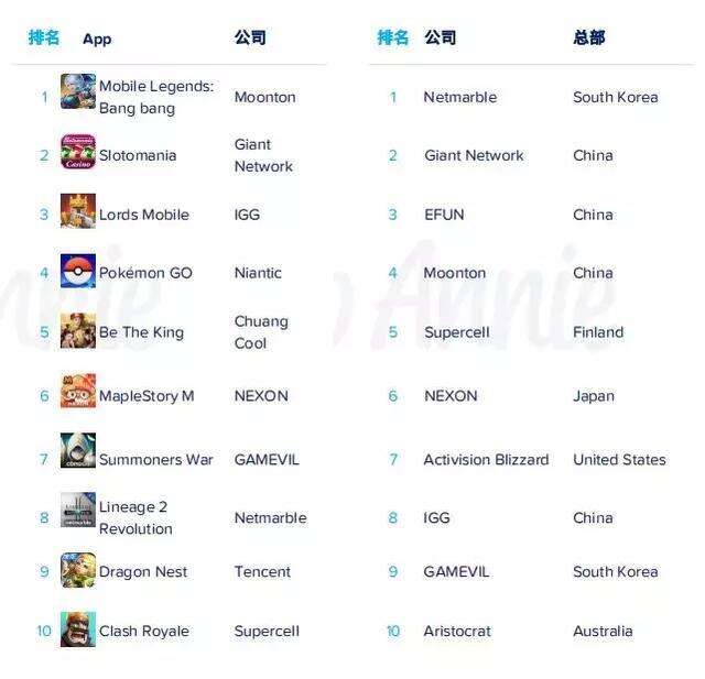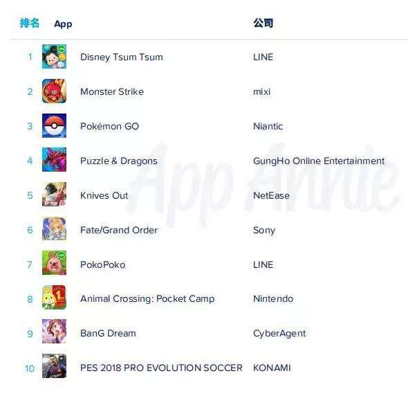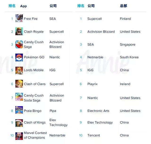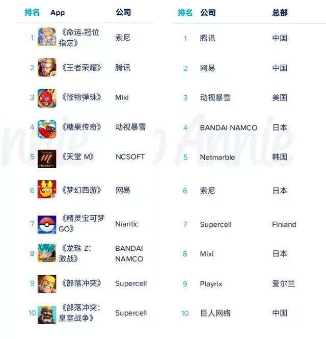 《命运-冠位指定》成为2018年全球付费最高的手机游戏,紧随其后的是腾讯的《王者荣耀》和Mixi的《怪物弹珠》。在前10名游戏中,有两个来自中国,Supercell是唯一一家两个游戏同时挤进前10名的公司。就公司收入而言,中国厂商和日本厂商各占3席,巨人网络除腾讯网易外排名第10。