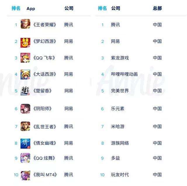 腾讯,网易产品收入榜:以50-50开盘趋势占据中国收入榜,《王者荣耀》、《梦幻西游》、《QQ飞车》占据前三。公司方面,除了腾讯网易,第三名是紫龙游戏,第四名是李必立,完美世界排名第五。