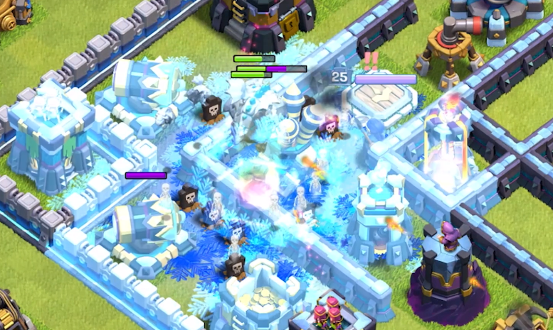 然后就是两个新的超级手臂,超级高手和冰猎犬。其中,超级法师有很强的AOE伤害能力,而冰猎犬则功能更强。因为冰猎犬可以提供大范围的冰冻减速效果。即使冰猎犬被击落,也会分裂成很多迷你冰猎犬,也有非常好的冰冻减速效果。也就是说,一个纯输出型,一个部分功能型,两个完整的超臂也为《部落冲突》臂匹配带来了更多的可能性。