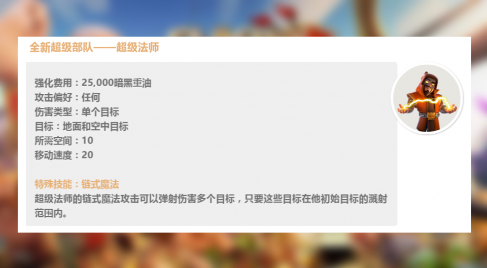 超级法师,对魔法有着深刻的理解,不再局限于简单的火球魔法,而是直接化身为闪电王。超级法师的攻击虽然是单个目标,但其伤害会连锁溅射,只要初始目标周围一定范围内有其他目标,忽略“全员”弹射数。