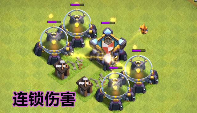 超级单位最重要的是特殊技能,超级法师的技能是“链魔”。火球击中目标后,还可以弹射攻击附近其他目标。如图,一个超级法师一次攻击就可以打到大本钟旁边的所有建筑。但是这个链伤的距离挺近的,目测超过2格就联系不上了。相对于雷电龙造成的连锁伤害,超级法师需要借助对手密集的阵来最大化伤害。所以形成之后,分散化肯定会成为主流。