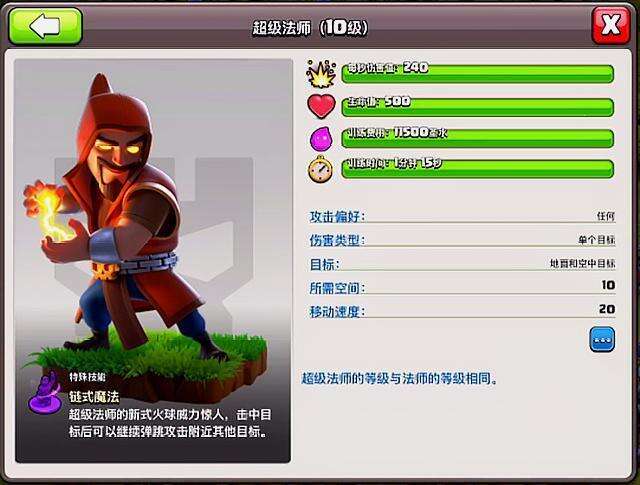 有12个超级法师,只能由9级法师转换。增强成本25000黑油。变身后他的满量程生命值将达到500点,每秒伤害高达240点。培训费11500圣水,说实话挺贵的。但是他的攻击偏好还是任意的,需要10个空格,移动速度20。从面板性质来看,他的伤害还是很高的,拆楼没问题。但是健康值并没有想象中的高,只能说还算满意,训练的圣水也配得上他的属性。