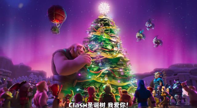 尤其是宣传片的结尾,随着动画镜头的缓慢延伸,一棵长满尖刺的秃树坐在电视机前,看着部落人物围着圣诞树狂欢。按照supercell的惯例,动画的每一帧都有内容和彩蛋,但这一次,如果给嘉年华后面一个特写,就不可能是简单的圣诞树点缀了!