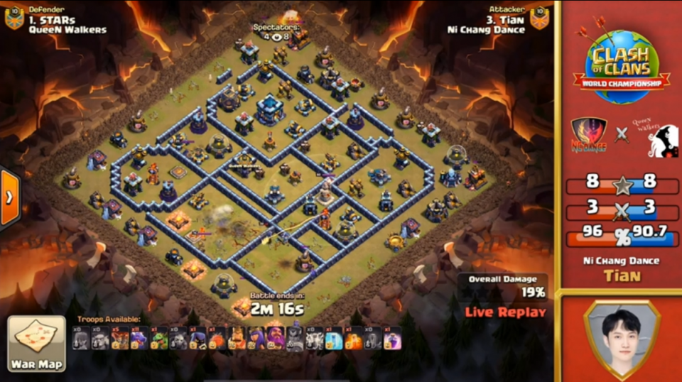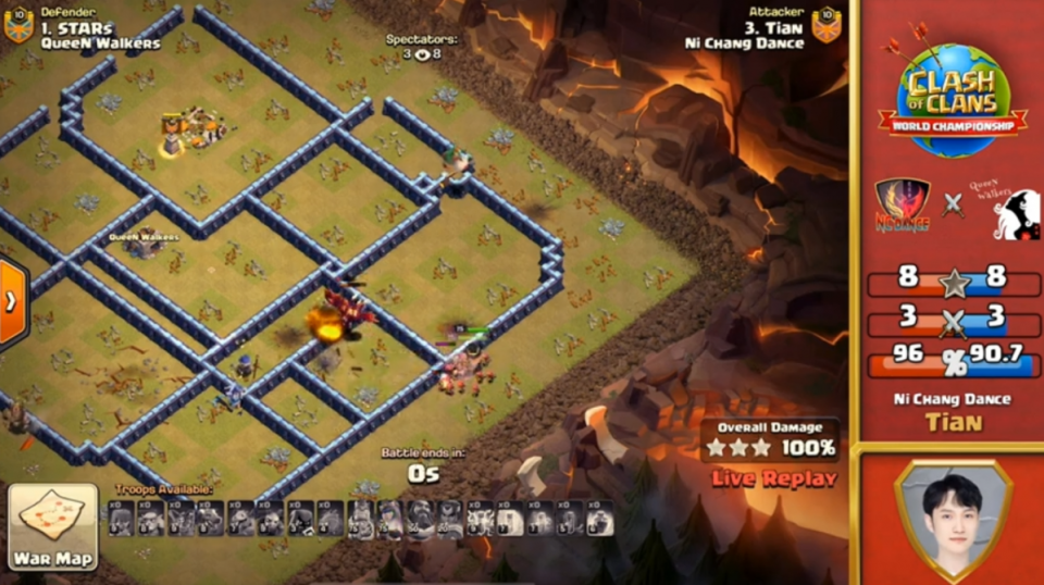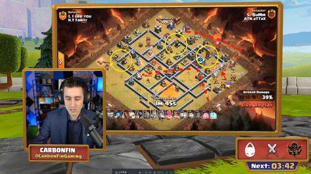 比如8强第一场对阵迷茫家族的时候,以13星领先。其中,ATN BuMm攻击《我看你》迷茫家庭,被评为最佳攻击。一开始,这位韩国球员选择了狗球流,开始了蛮王,女王的破边,在清理完边缘后,他给了飞跃土以得到公牛。之后直接给狗球。防空火箭在大本钟,攻城气球直接触发大本钟。之后给狗球一个无敌,提前开启冰冻法术,然后轻松拿下比赛。