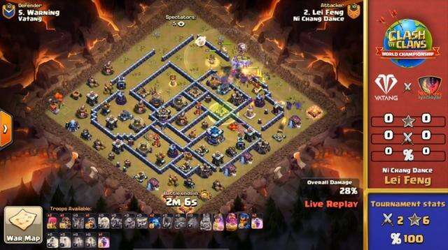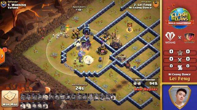 然后就是雷锋在对阵瓦堂的6合4比赛中犀利的预警操作。当初雷锋还是选择了他擅长的天罡蓝。一开始,他用速度球清理了箭塔和法师塔,然后飞机进入战斗多头塔和X弩。然后,他用女王滑梯杀死了援军,并在2点钟打开了墙。然后,他给了无敌多头塔和大本钟,女王也来带大本钟。