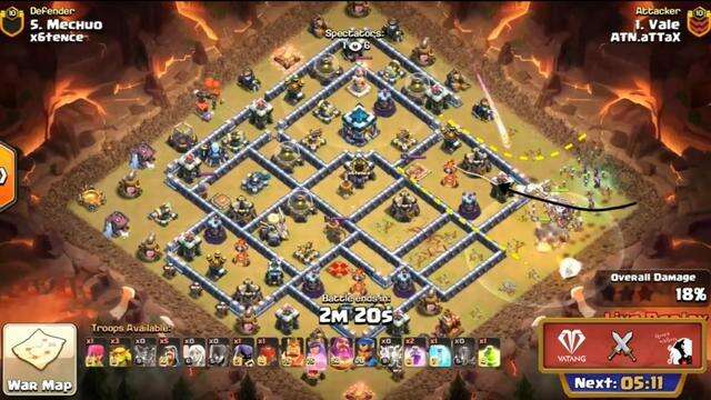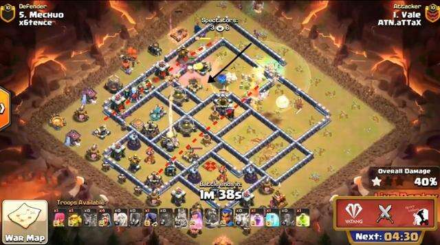 而在4轮6中,打x6tence,ATN谷进攻x6tence的米丘。他用了天使女巫流。他先是用闪电地震袭击了X弩和投石,然后咏王去清理大炮和防空的区域,然后用超哥打破了上下外围边缘。