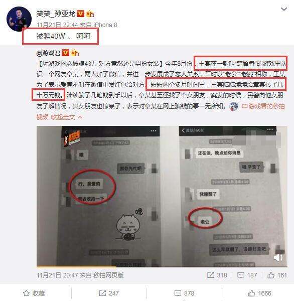 当然,这不是重点。关键是这个叫《楚留香》的手游是否是所有网友都熟悉的。对,没错!就是那个让孙亚龙绿了,让他去赔了夫人又折兵的手游这个消息也引起了德云社晓晓本人的关注。他只发了一句:“被骗40万,呵呵”,可见他对那件事印象有多深。