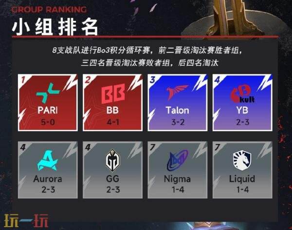 其他场次中,PARI继续保持不败,2-1战胜Aurora;Liquid在Nigma身上终于拿下第二阶段的首场胜利;BB与GG有来有回,最终BB在第三局的二代肉山团中确立优势,击败了GG。