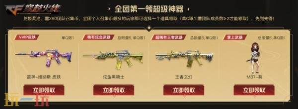 CFer还可以选择与其他玩家组建团队,通过完成召集币任务在活动期间领取奖励礼品。成功获得280团队召集币后,全团个人召集币最多的玩家即可选择一个道具收入囊中,雷神-维纳斯皮肤、炫金黑骑士、王者之幻、M37-葵均已加入奖池等待玩家兑换领取!