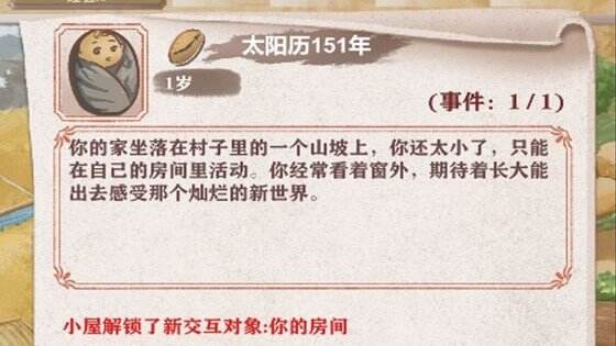 在轮回中,我们会从一个婴儿开始成长,每个周期我们能够通过体力来进行一些行为,譬如看书(提升智力)、帮爸爸砍柴(提升勇猛)、问老妈要零花钱等等行为,就是体力与资源/属性收益的一种转换。一般情况下,在体力消耗完之后,我们就要进入下一周期。