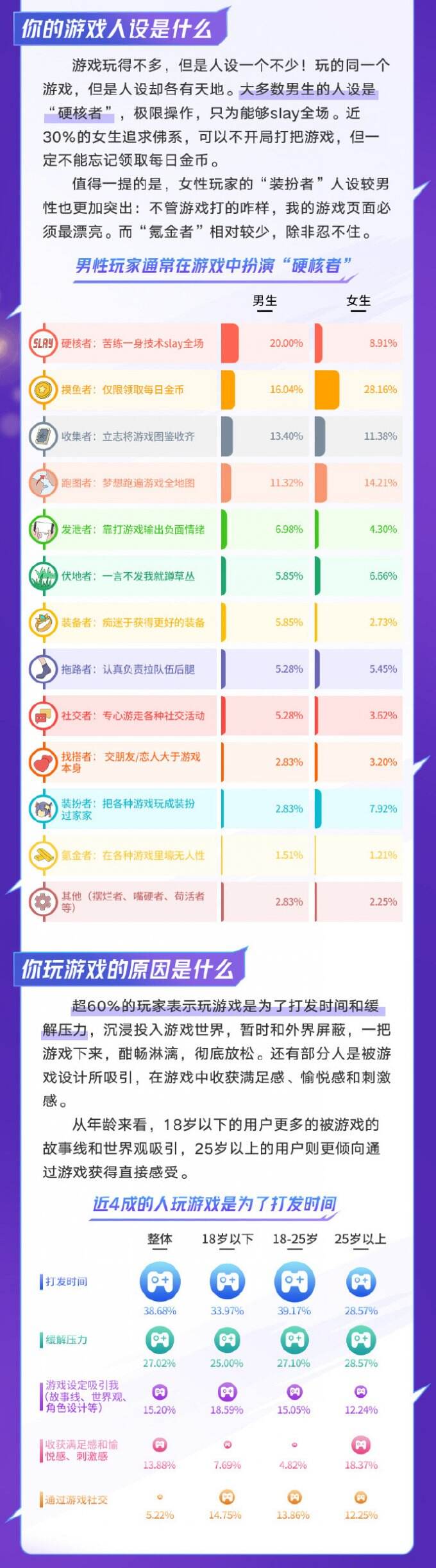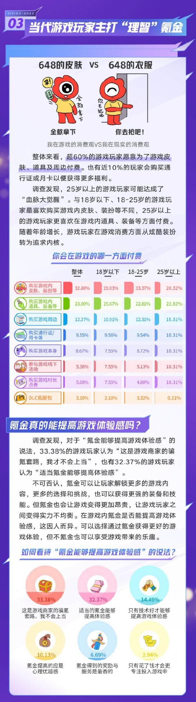 截至统计(2023年10月),调查共收到来自1552名游戏玩家的有效作答问卷。本报告相关分析仅针对本次统计回收的数据。超60%的玩家表示玩游戏是为了打发时间和缓解压力,超60%的游戏玩家愿意为了游戏皮肤、道具及周边付费。
