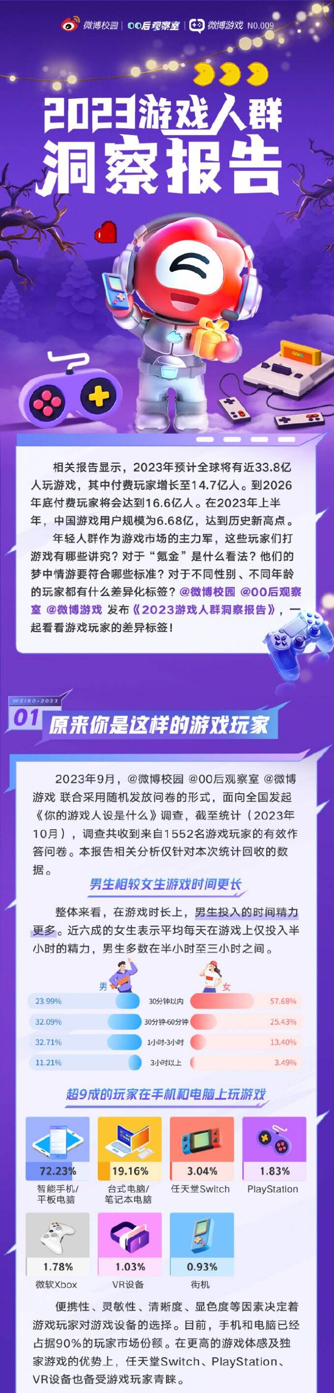 新浪校园 联合 00后观察室 发布了2023年游戏人群洞察报告,根据报告显示,2023年预计全球将有近33.8亿人玩游戏,其中付费玩家增长至14.7亿人。到2026年底付费玩家将会达到16.6亿人。在2023年上半年,中国游戏用户规模为6.68亿,达到历史新高点。