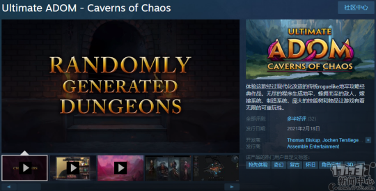 《Ultimate ADOM - Caverns of Chaos》是一款由Thomas Biskup制作的roguelike地牢爬塔类游戏。在游戏中玩家将会面临无尽的程序生成地牢,蜂拥而至的敌人,嫁接系统,制造系统,庞大的技能树和物品让游戏有着无限的可重玩性。